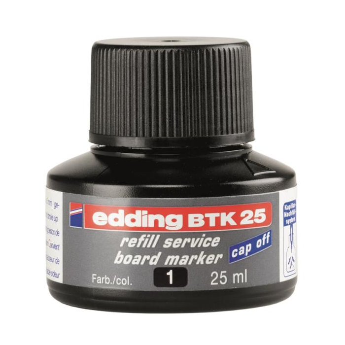 Atrament slabého zápachu s kapilárnym systémom na dopĺňanie popisovačov edding 250, 360, 361 a 363, určených na biele tabule. Tento chemický prípravok je nebezpečný. Obsah fľaštičky 25 ml.Pri doĺňaní vložte prednú časť popisovača špičkou do fľaštičky a po niekoľkých minútach bude popisovač pripravený k opätovnému použitiu. Farba: čierna