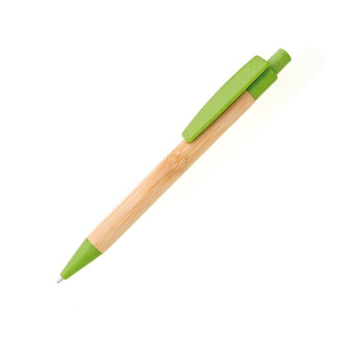 Bambusové telo pera s doplnkami z plastu s podielom slamy. Náplň modro píšuca veľkoobsahová. Farba svetlo zelená.