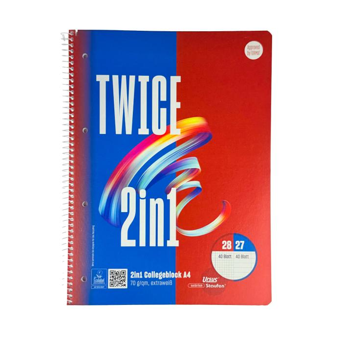 Vysokokvalitný blok formátu A4 dva v jednom. S kovovou bočnou špirálou, vyrobený z recyklovaného papiera s hmotnosťou 70 g / m².