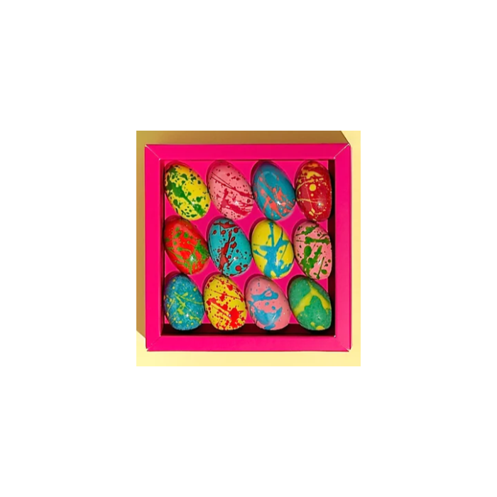 Tucet, ručne maľovaných, plnených čokoládových polo vajíčok v jednej žiarivo-žltej krabici. Základom je horká čokoláda. Plnené sú ľahodným, oceneným, nugátovým krémom. .... a jar je tu opät!