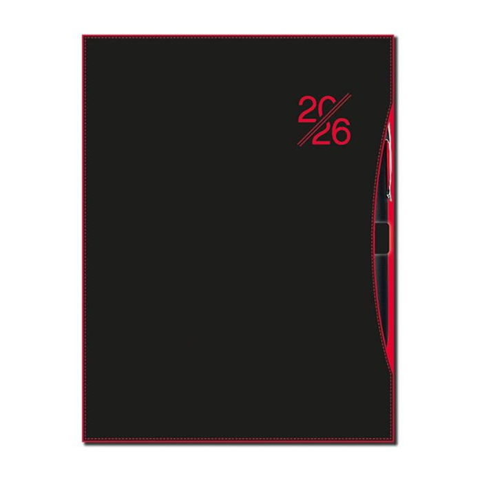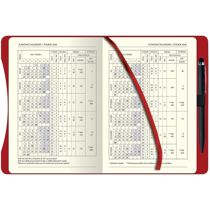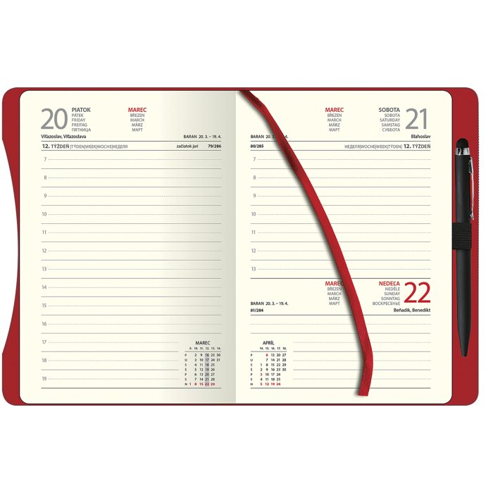 Denný diár s prehľadným kalendáriom na každý deň s pútkom a vloženým perom. Diár je v pevnej väzbe z pogumovaného poťahu s razbou roka. Obsahuje slovenské kalendárium.