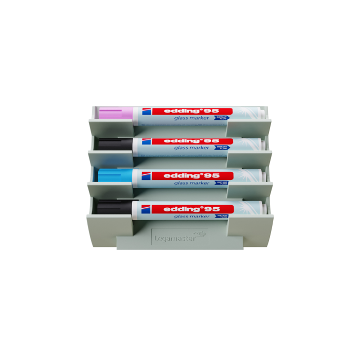 Ideálne riešenie na uloženie tabuľových popisovačov. Podporuje zásady čistého pracovného stola a pomáha udržiavať poriadok v kancelárskych priestoroch. Majte svoje značky vždy na dosah. Magnetické: jednoduché pripevnenie a premiestnenie. Značky sú uložené vo vodorovnej polohe pre optimálnu kvalitu atramentu pri písaní. Magnetický držiak popisovačov na sklenené tabule. Pojme až 4 popisovače na tabuli. Vhodné pre sklenené tabule s povrchom magnetickej tabule. Dodáva sa s extra silným neodýmovým magnetom pre použitie na sklenené dosky. Presne ladí s farbami matnej sklenenej dosky Legamaster sage green. Značky nie sú súčasťou dodávky.