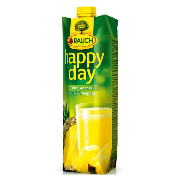 Rauch Happy Day Ananas 100% 1 L. ZLOŽENIE: 100% ananasová šťava vyrobená z ananasového koncentrátu. PODMIENKY SKLADOVANIA: Chráňte pred mrazom a priamym slnečným žiarením. Po otvorení uchovávajte v chlade a spotrebujte do 3 dní. VÝROBCA: Rauch Slovensko, s.r.o. Trnavská cesta 82 821 02 Bratislava.