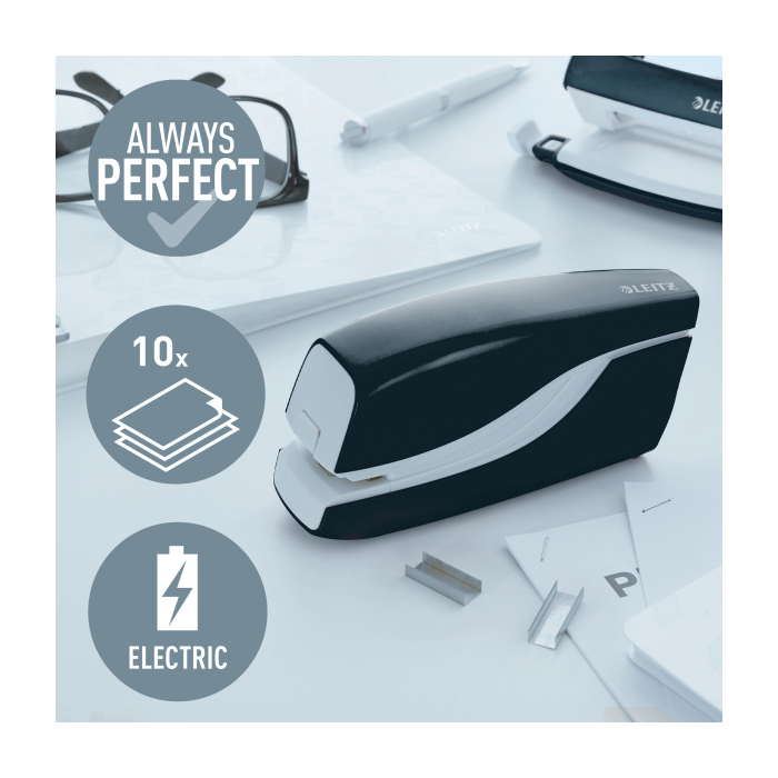 Elektrická zošívačka Leitz New NeXXt WOW. Vďaka jednoduchému ovládaniu jednou rukou je ideálna na časté používanie. Technológia s napájaním na batérie na zošívanie v pohybe. V žiarivých farbách WOW. Batérie (4× 1,5 V AAA LR03) nie sú súčasťou balenia. Kapacita 10 listov. Náhradné spinky ES556800. Farba čierna.