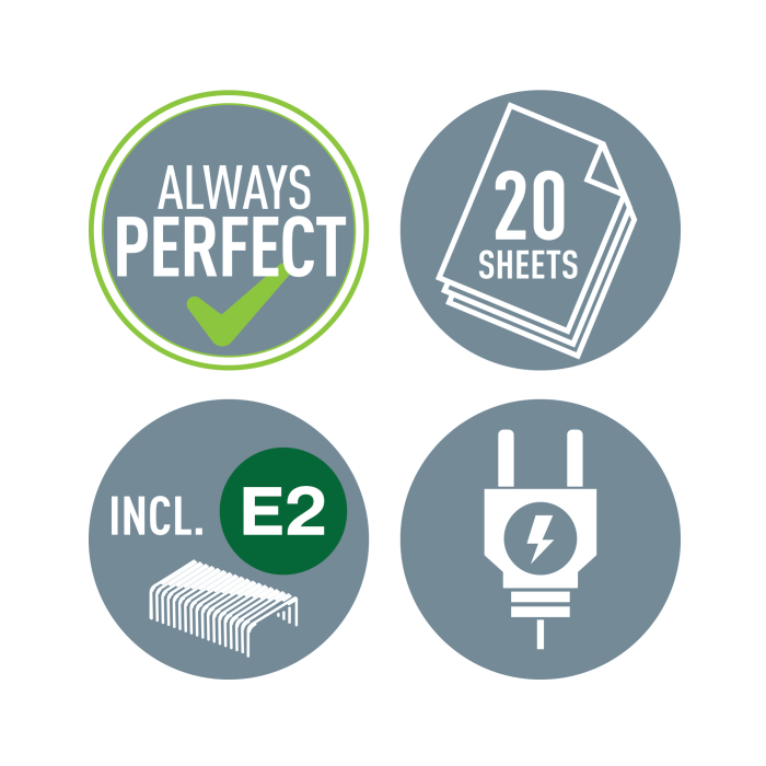 Rýchle zošívanie bez námahy. Ideálna na časté použitie. Vysoký výkon. Jednoduché ovládanie jednou rukou. Plochá technológia ušetrí pri archivovaní až 30 % miesta. Drôtiky Leitz Electric E2 zaručujú pri každom použití dokonalé zošitie bez zasekávania. Kapacita zošívania: 20 hárkov (80 g/m2)