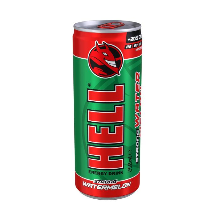 Letná chuť HELL STRONG WATERMELON s príchuťou vodného melónu, o 20 % viac kofeínu namiesto 32 mg / 100 ml, bez konzervantov, s prídavkom 5 druhov vitamínov B, v nekonečne recyklovateľnom obale na vás čaká, aby sa stal súčasťou vášho každodenného života.