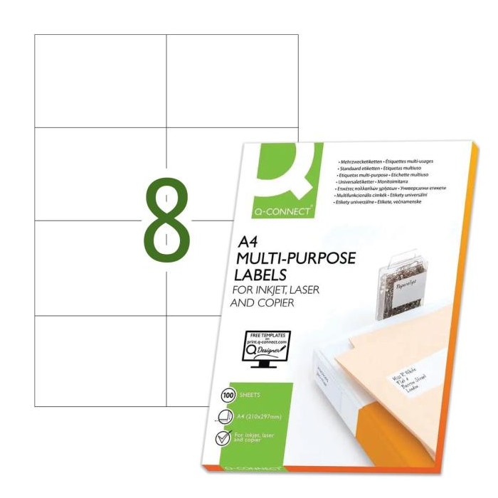 Univerzálne samolepiace etikety pre laserové a atramentové tlačiarne a kopírovacie zariadenia. Formát A4. Farba biela. Balenie 100 hárkov. Etikety na hárku 8 ks.