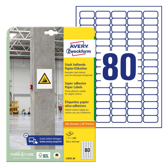 Biele, extrémne priľnavé papierové štítky sú dvakrát pevnejšie ako bežné papierové štítky. Vďaka tomu sú štítky vo formáte 35,6 x 16,9 mm obzvlášť vhodné na identifikáciu a označovanie produktov a inventára a na vytváranie varovných a bezpečnostných upozornení v interiéri. Papierové štítky sa lepia aj na ťažké povrchy, ako sú nerovné, drsné, vlhké alebo zaprášené povrchy pri rôznych teplotách. Môžete sa spoľahnúť na zaručený chod tlačiarne bez zaseknutia bez akýchkoľvek usadenín lepidla v tlačiarni. Etikety je možné tlačiť na všetkých bežných laserových a atramentových tlačiarňach.