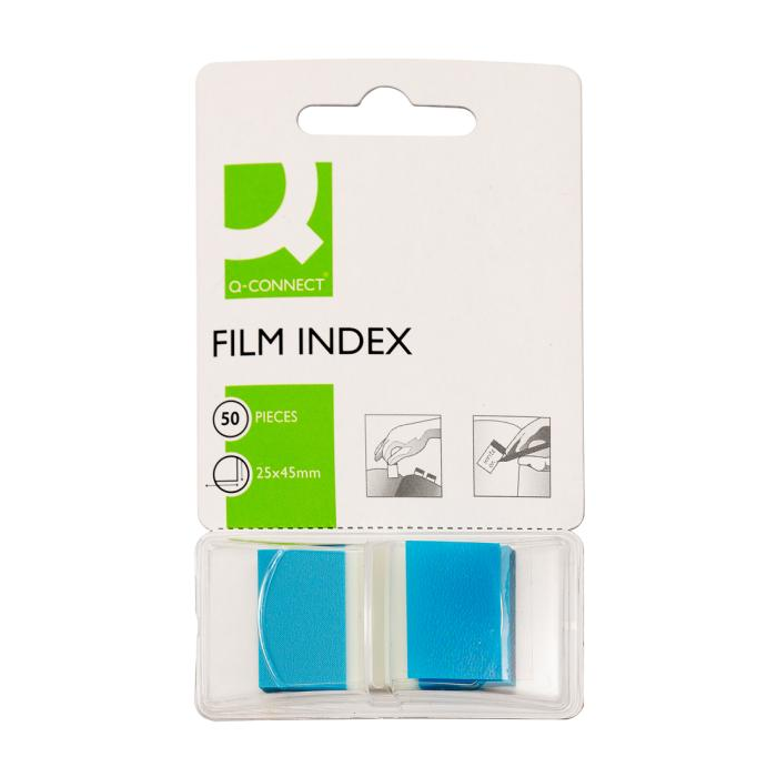 Indexové fóliové lístky, popisovateľné a snímateľné. Rozmery 25 × 43 mm. V balení 50 lístkov. Farba modrá.