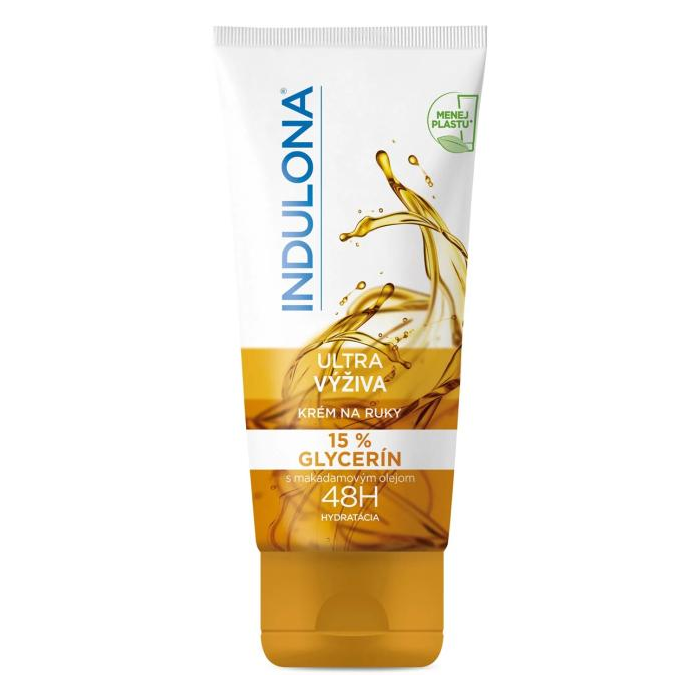 INDULONA Krém na ruky ULTRA VÝŽIVA je obohatený o15 % glycerínu, efektívnu hydratačnú látku, ktorá podporuje zdravý vzhľad pokožky. Glycerín udržuje v pokožke prirodzenú úroveň hydratácie a chráni suchú pokožku pred vonkajšími vplyvmi. Makadamový olej, bohatý na vitamín E, pomáha vyživovať suchú pokožku.