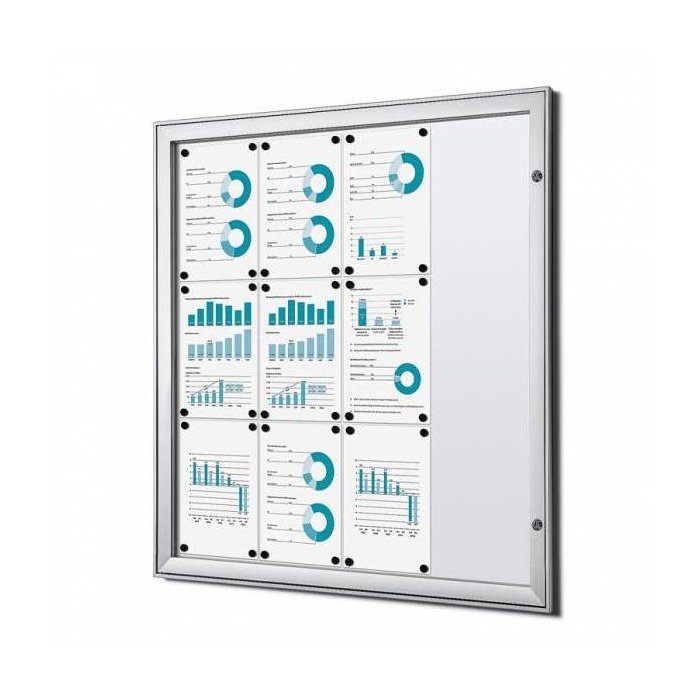 Ekonomický variant hliníkovej vitríny s protipožiarnym atestom do interiéru. S uzamykateľnými polykarbonátovými dveremi s hliníkovým orámovaním, ktoré sa otvárajú do strany. Lakovaná oceľová zadná stena vhodná pre magnety a popisovanie fixami. Dodávaná s dvoma kľúčmi k zámku.