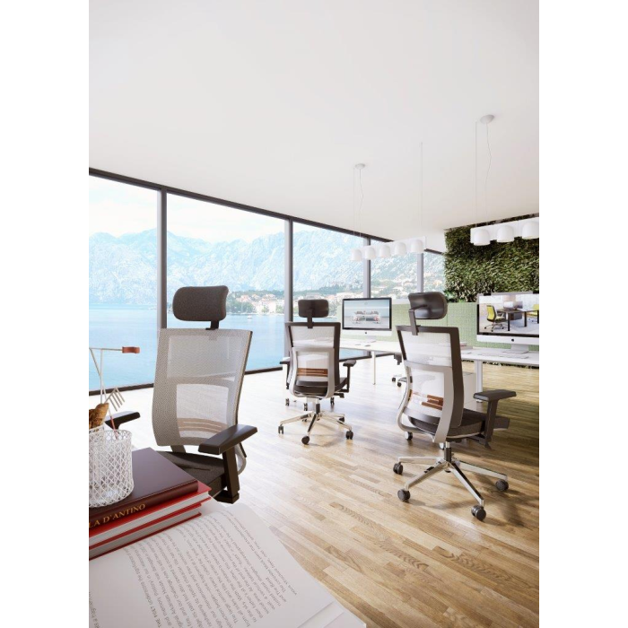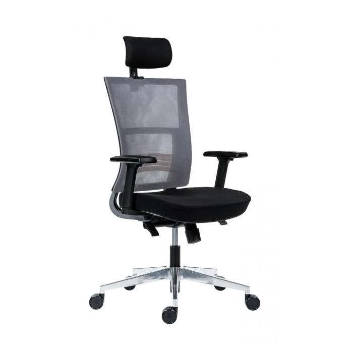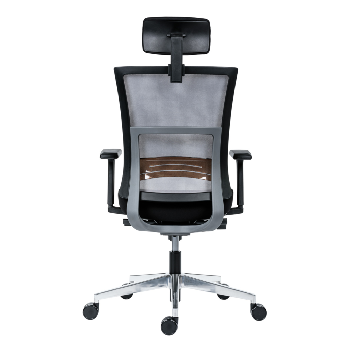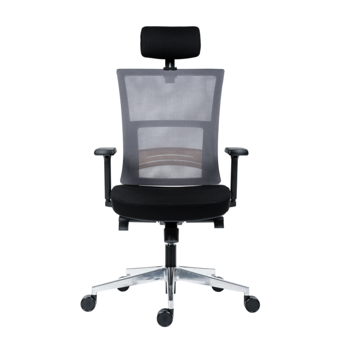 • kancelárska stolička s vysokým priedušným operadlom, opierkou hlavy, podrúčkami a molitánom sedáku zo studenej peny, synchrónny mechanizmus s nastavením sily protiváhy
