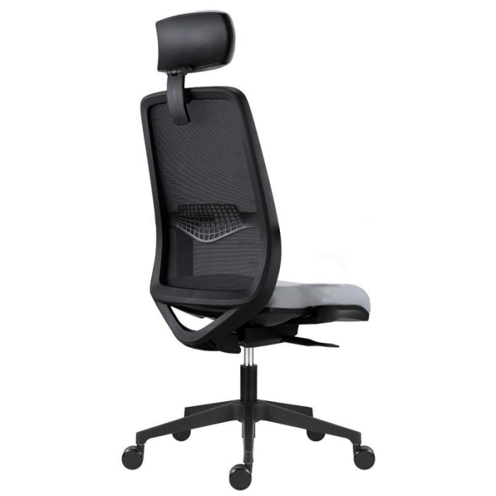 • kancelárska stolička s čiernou sieťovinou na operadle, podhlavníkom a nastaviteľnou bedrovou výstuhou