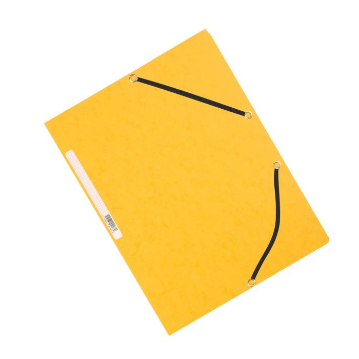 Obal s tromi chlopňami a gumičkou z kvalitného hladkého kartónu gramáže 375 g. Chrbtový štítok, kapacita 200 listov. Farba žltá.