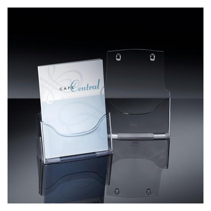 Stolný stojan s jedným odkladačom unikátneho dizajnu z vysokokvalitného akrylu. Ideálny na brožúry, katalógy a letáky. Hĺbka odkladača 30 mm. 25-ročná záruka na odolnosť voči UV žiareniu. Rozmery 240 × 290 × 90 mm. Farba číra.