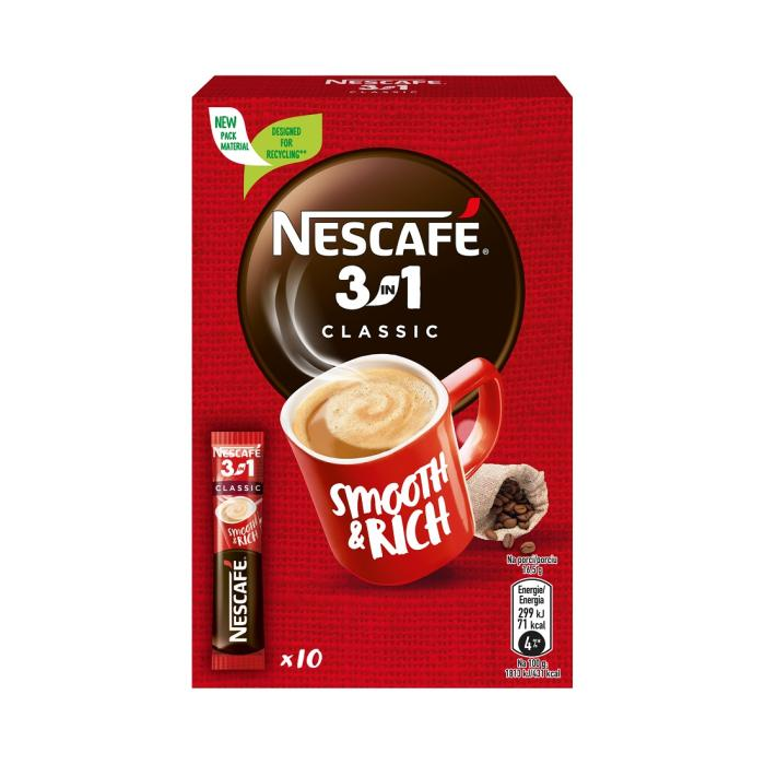 S kávami NESCAFÉ si môžete vychutnať autentickú chuť a arómu kávy NESCAFÉ s jemne mliečnou a sladkou chuťou, obohatenou o lahodnú penu na povrchu. Vďaka praktickému baleniu v jednoporciových vreckách si pohodlne pripravíte svoju obľúbenú šálku NESCAFÉ Classic kedykoľvek a kdekoľvek. Hmotnosť 10 × 16,5 g.