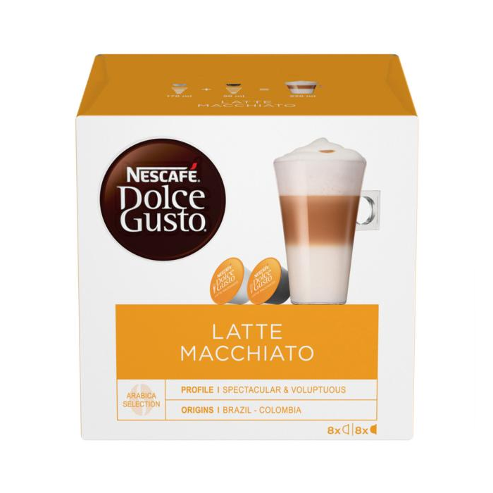 Kávové kapsule NESCAFÉ® Dolce Gusto® Latte Macchiato vám ponúknu prvotriednu kvalitu, s jednoduchosťou prípravy. Latte Macchiato je veľkolepo vrstvená káva vytvorená z horúceho mlieka, jemnej kávy a kyprej peny. Základom je bohaté a hebké espresso špeciálne zmiešané z kávových zŕn odrôd arabika a robusta zo štyroch prvotriednych lokalít, vrátane jemných brazílskych a bohato ovocných kolumbijských zŕn kávy arabika. Dopĺňa ho nadýchaná jemná pena. Balenie obsahuje 16 kapsúl (8 kávových a 8 mliečnych) navrhnutých pre kávovary NESCAFÉ® Dolce Gusto®.