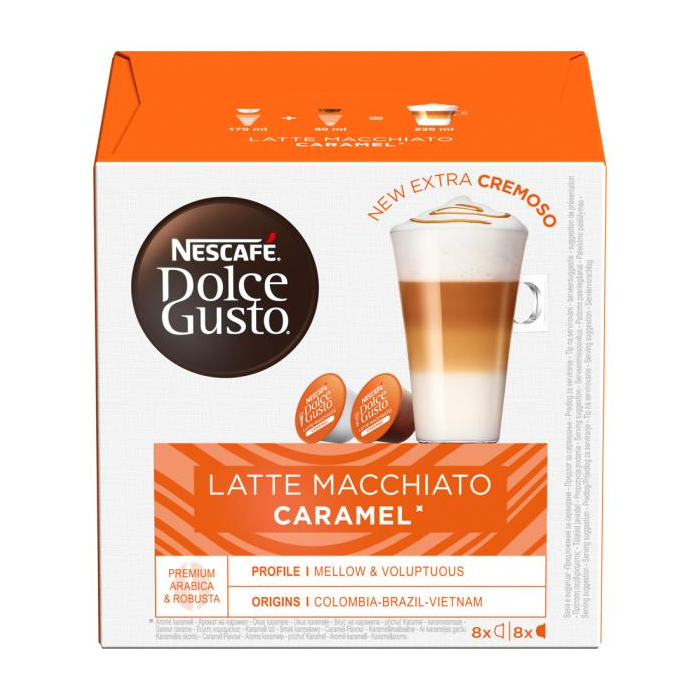 Kávové kapsule NESCAFÉ® Dolce Gusto® Latte Macchiato Caramel vám ponúknu prvotriednu kvalitu, s jednoduchosťou prípravy. Latte Macchiato je veľkolepo vrstvená káva vytvorená z horúceho mlieka, karamelovej príchute, jemnej kávy a kyprej peny. Základom je bohaté a hebké espresso špeciálne zmiešané z kávových zŕn odrôd arabika a robusta zo štyroch prvotriednych lokalít, vrátane jemných brazílskych a bohato ovocných kolumbijských zŕn kávy arabika. Dopĺňa ho nadýchaná jemná pena s karamelovou príchuťou. Balenie obsahuje 16 kapsúl (8 kávových a 8 mliečnych) navrhnutých pre kávovary NESCAFÉ® Dolce Gusto®.