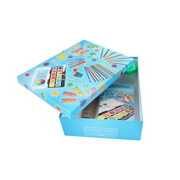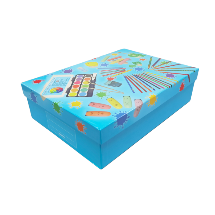 Perfektne navrhnutý box na uskladnenie a organizáciu výtvarných a školských potrieb. Bez problémov sa doň zmestí výkresový blok formátu A4, zošit či zápisník. Vyrobený z pevného kartónu, potiahnutý papierom s lesklým povrchom a praktickou plochou na popis, pevné veko. Rozmery: veko: 33,5 × 24 × 3 cm, box: 33 × 23,5 × 9 cm.