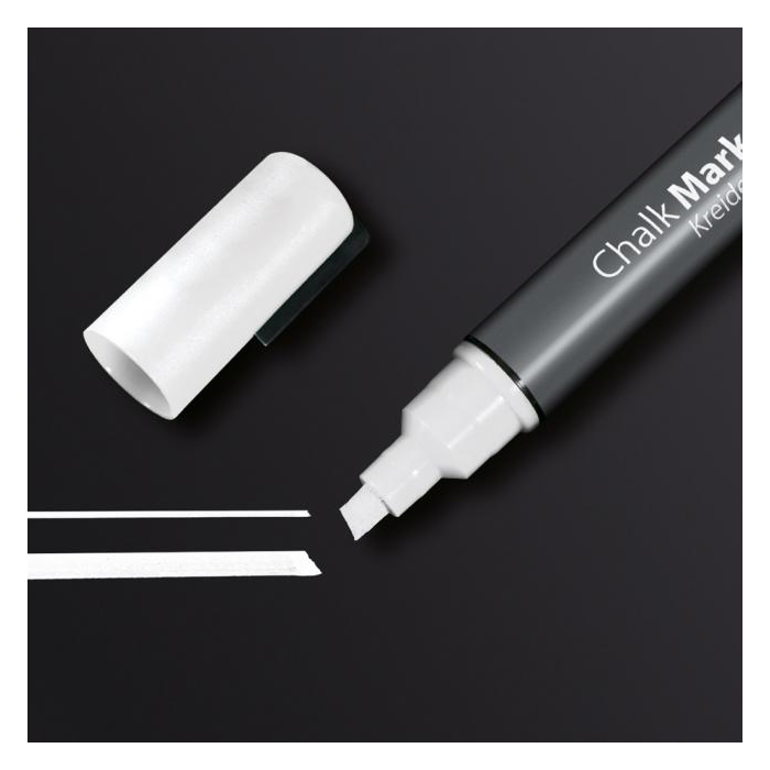 Ľahko stierateľné a vysoko nepriehľadné kriedové popisovače vhodné na sklenené tabule a všetky hladké povrchy podobné sklu. Zrezaný hrot hrúbky 1 - 5 mm. Vodeodolný atrament je zmazateľný vlhkou alebo suchou utierkou. Farba biela.