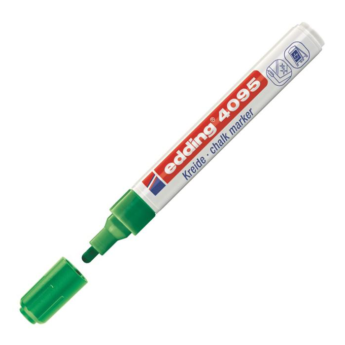Tekutá krieda na báze vody. Popisovač určený na návrhy, dekorácie a značenie na sklo, okná, tabule a iné nepórovité povrchy. Okrúhly hrot, bez zápachu, zmazateľný vlhkou handričkou z takmer všetkých nepórovitých povrchov. Farba zelená. Väčšie balenie 10 ks. Hrúbka hrotu 2-3 nmm.
