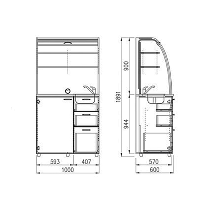 • Dve police vo vrchnej časti kuchynky poskytujú dostatočnú kapacitu na poháre, šálky a taniere. Na pracovnú dosku môžete umiestniť napr. kávovar a káblovou priechodkou v zadnej časti vyvediete kábel z priestoru kuchynky.