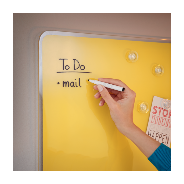 Dodáva sa s čiernym popisovačom na suché stieranie, ktorý má na viečku vstavaný čistiaci kus. Magnetický popisovač drží priložený kdekoľvek na tabuli.