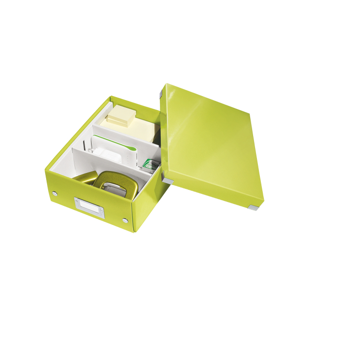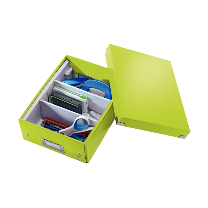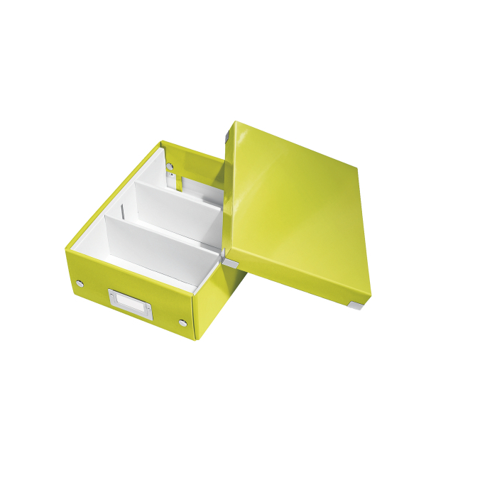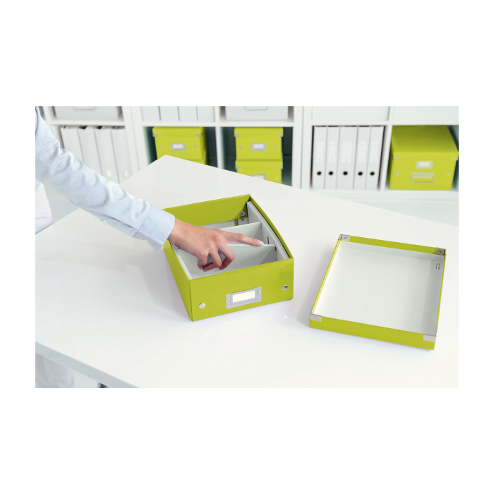Malá štýlová skladacia krabica s vekom a s rámčekom na štítok. Na usporiadanie nabíjačiek, káblov a ďalšieho vybavenia kancelárie. Veľkosť S. Na prvý pohľad vidíte, čo sa vojde dovnútra! Výška krabice bola navrhnutá tak, aby vám poskytla dostatok priestoru na uloženie príslušenstva a zároveň zabránila skladaniu vecí na seba. Na vylepšenie usporiadania obsahu krabice použite priložený vnútorný systém priehradiek. Môžete rozdeliť krabicu na 2 alebo 3 časti a zabrániť tak miešaniu káblov alebo fotiek. Inteligentná skladacia konštrukcia: rýchle a jednoduché zloženie bez nutnosti použitia skrutiek a možnosť opätovného rozloženia na úsporu miesta, keď krabicu práve nepotrebujete. Moderný vzhľad a farby na skrášlenie vašej kancelárie alebo domova. Lesklé vyhotovenie vytvára prvotriedny vzhľad krabice a umožňuje dlhodobé používanie a jednoduché utieranie prachu. Rámček na štítok pre jednoduché označenie obsahu. Materiál pevný kartón potiahnutý polaminovaným papierom. Farba zelená.