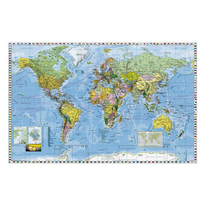 Nástenná mapa Svet politický je po celom obvode lemovaná vlajkami štátov.Na mape je vyznačené aktuálne politické rozdelenie dnešného sveta s hlavnými a väčšími mestami. Ďalej sa na mape nachádza mapka časových pasiem, vyznačenie morských prúdov, hĺbok a reliéf zeme. Mapa je vhodná na trvalé vyvesenie. Je obojstranne laminovaná a lištovaná. Rozmery: 145x100 cm Mierka: 1: 28.5 mil.