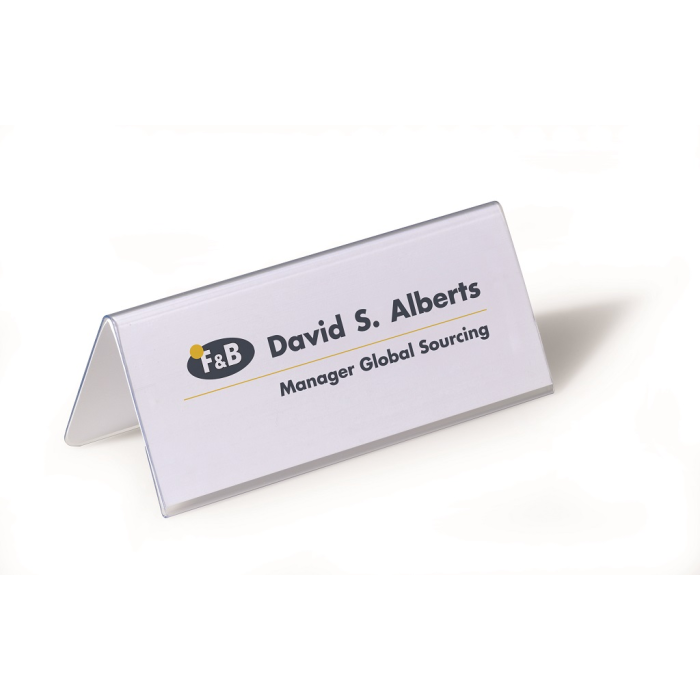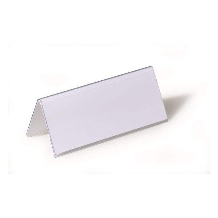 Obojstranne čitateľná stolová menovka z pevného PVC, vhodná na konferencie, recepčné pulty, ceny tovarov a popis produktov. Dodávaná s vymeniteľnou prázdnou kartou. Väčšie balenie 25 ks.