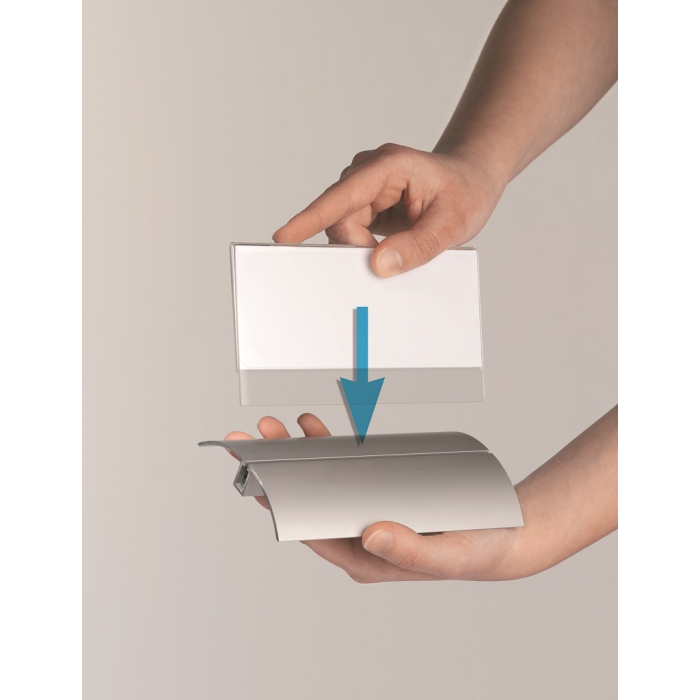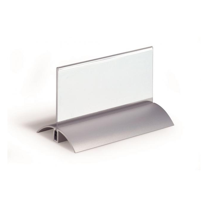 Štýlová stolová menovka s hliníkovým podstavcom. Unikátny uchytávací systém zabraňuje samovoľnému alebo neželanému vysunutiu menovky.Čítanie z oboch strán. Ideálna na konferencie, porady alebo miesta na styk so zákazníkom. Balenie 2 ks.