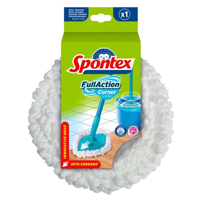 Full Action Corner System strapcová náhrada zo 100% mikrovlákna v tvare citrónu, ktorý umožňuje ľahké upratovanie rohov. Náhrada sa ľahko upevňuje pomocou suchého zipsu. Je účinná iba s vodou, odstráni 99% baktérií aj bez použitia detergentov. Vhodná pre všetky typy podláh. Rozmery: 230 x 220 mm