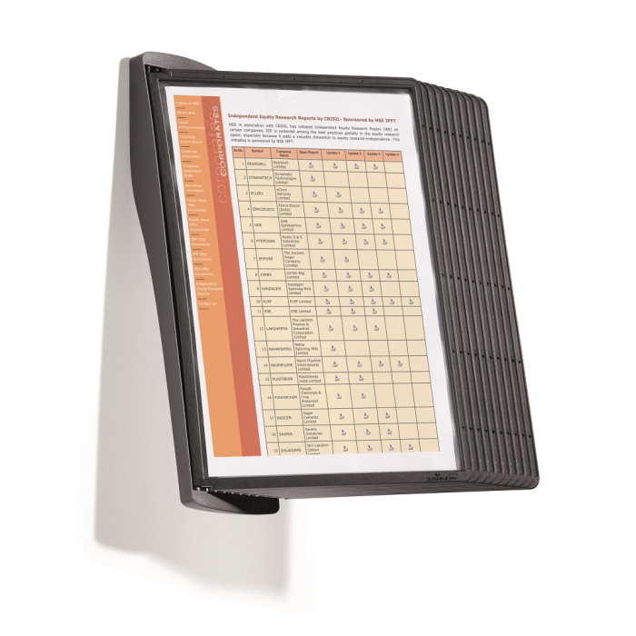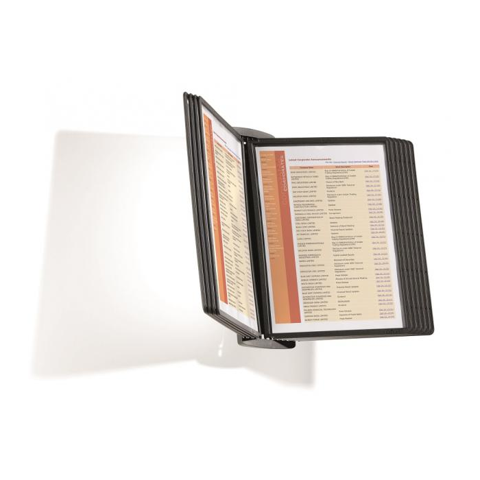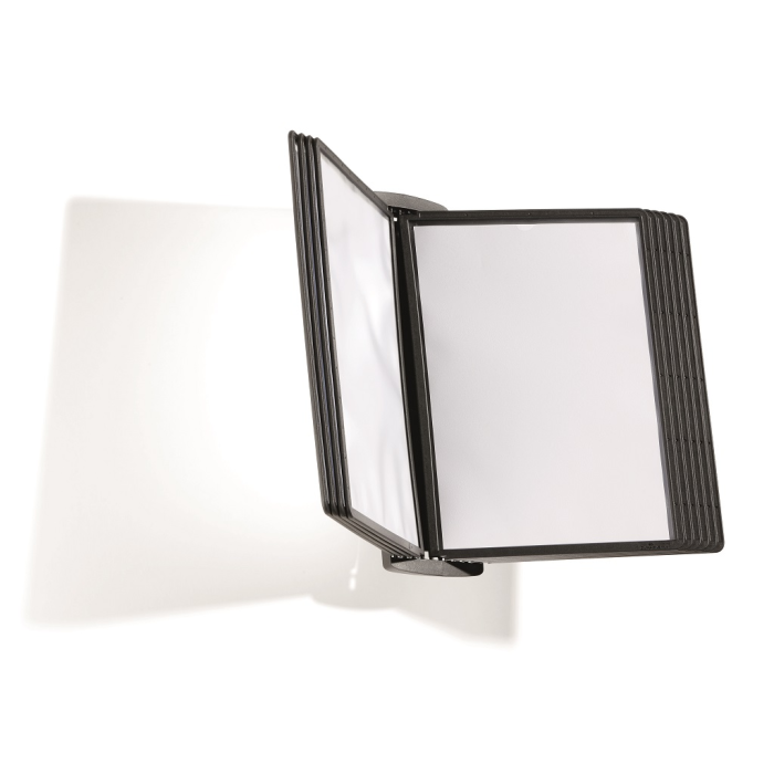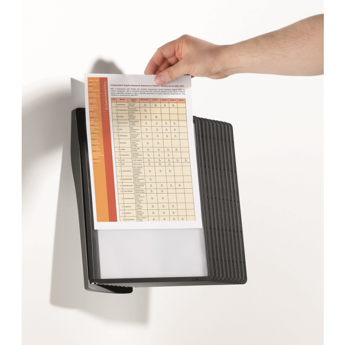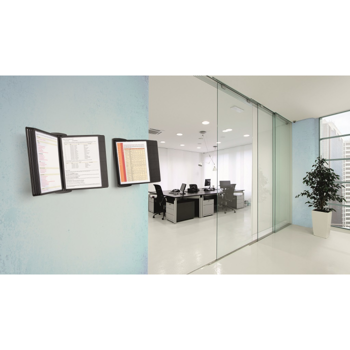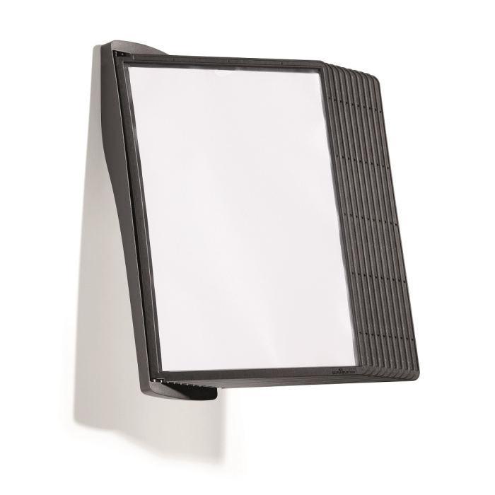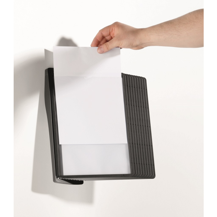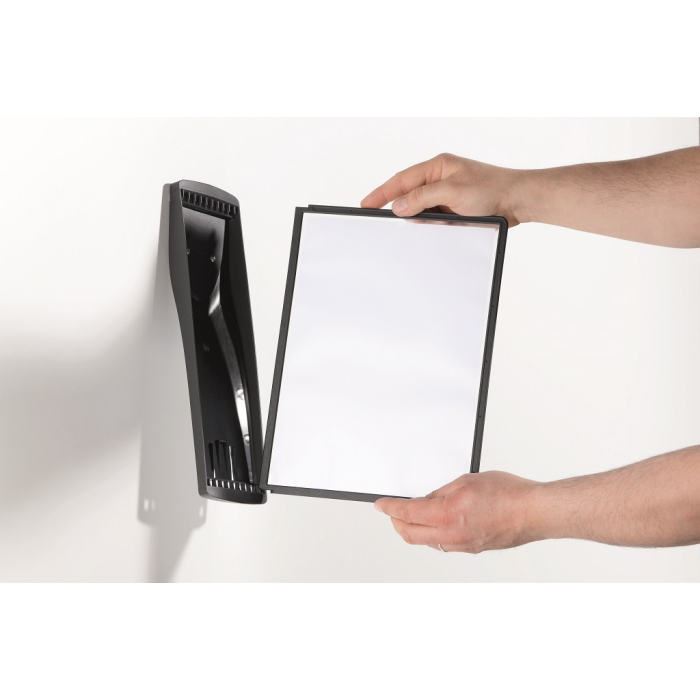 Štýlový nástenný stojan dodávaný s 10 displejovými panelmi a indexami. Ideálny do kancelárií a na verejne prístupné miesta. Otvor na hornej strane panelu zabezpečuje jednoduché vkladanie a v prípade potreby rýchlu výmenu vložených materiálov. Farba panelov čierna.