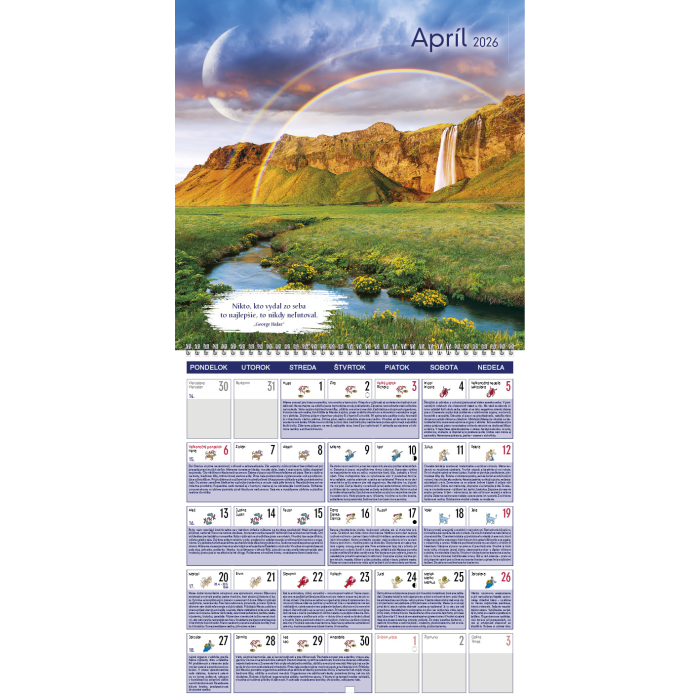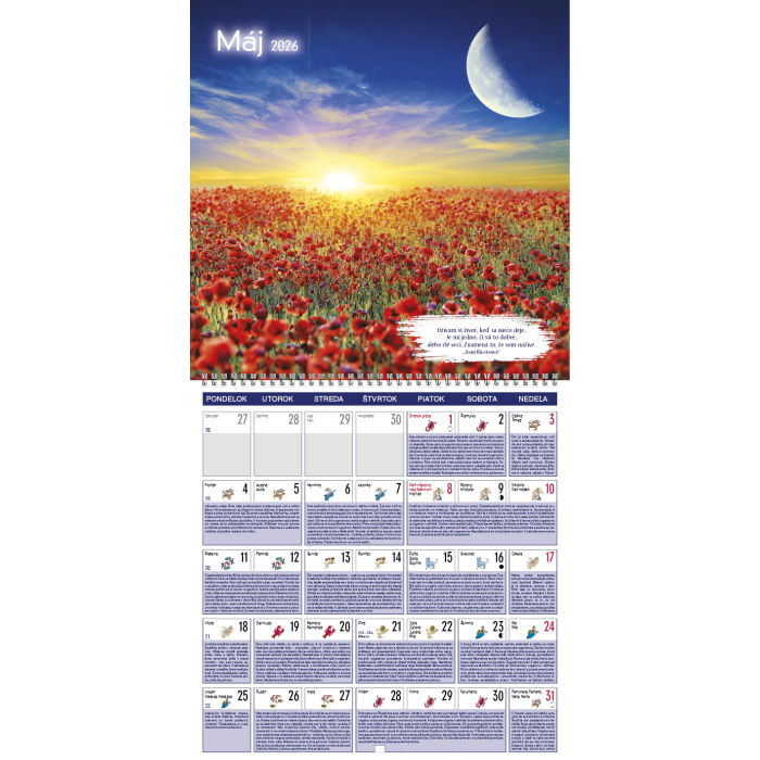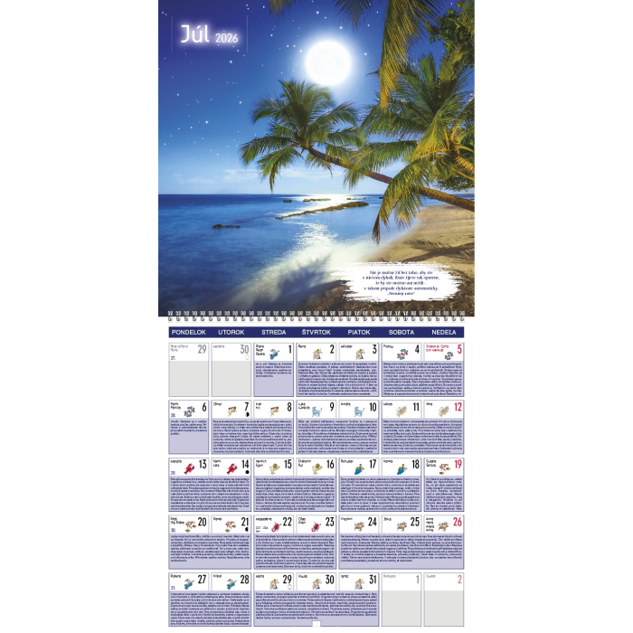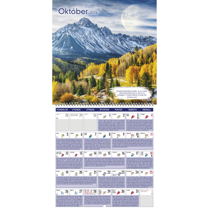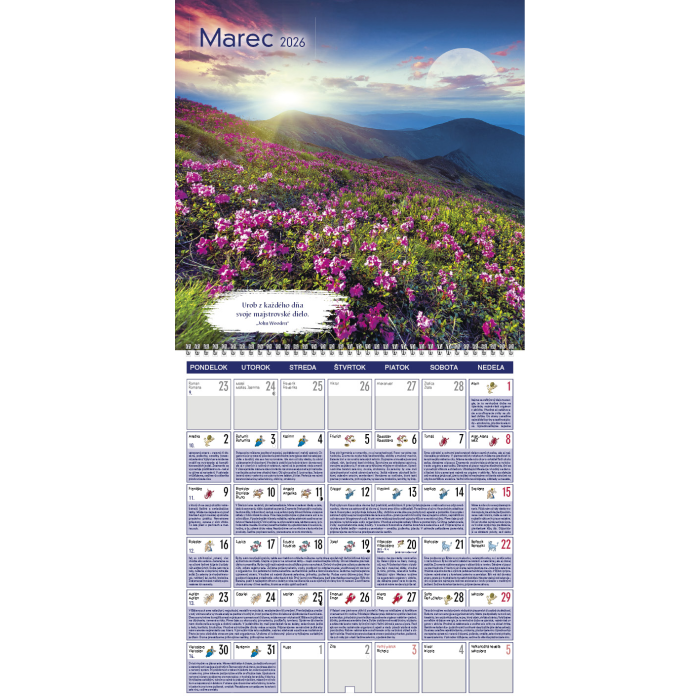 Tento kalendár ponúka praktické rady pre každý deň, ktoré sa riadia podľa fáz Mesiaca. Dozviete sa, kedy je vhodný čas na odpočinok, aktivitu, rozhodovanie či starostlivosť o telo a dušu. Každá fáza prináša odporúčania, čo robiť a čomu sa radšej vyhnúť. Silné fotografie a inšpiratívne citáty dodávajú kalendáru výnimočnú atmosféru.