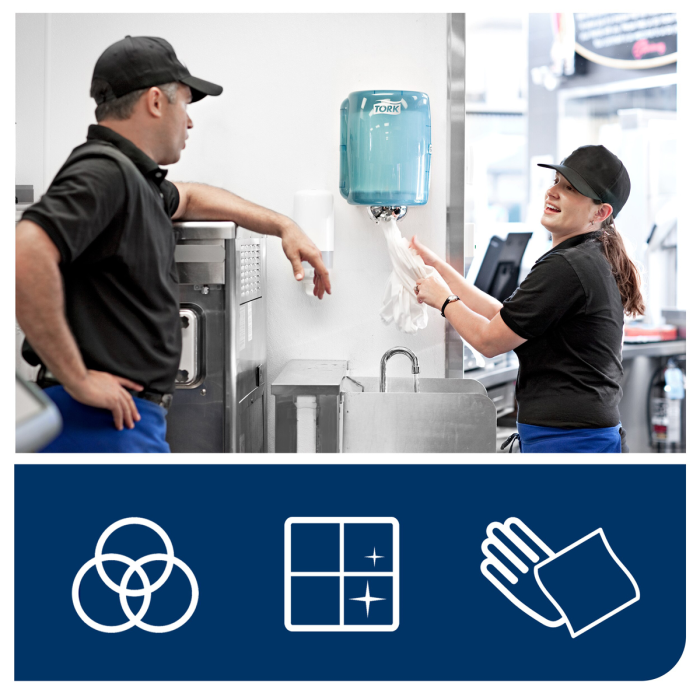 Tork jednovrstvová viacúčelová papierová utierka je ideálna na ľahké úlohy čistenia a na utieranie rúk. Táto papierová utierka sa môže používať v Tork® zásobníku na kotúče so stredovým odvíjaním, ktorý je vysokokapacitným, viacúčelovým riešením pre profesionálne prostredia, kde sú na utieranie povrchu potrebné obe ruky.