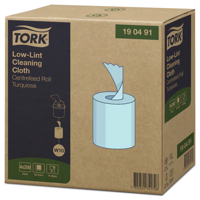 Tork Low-Lint čistiaca utierka je pevná a pružná. Utierky sa dodávajú ako náplň do zásobníka v kotúči, čo umožňuje vytvoriť vlastné vlhčené utierky s použitím požadovaných chemikálií. Jednorazové dávkovanie a jednoducho uzatvárateľné veko zabraňujú vyschn
