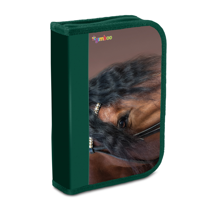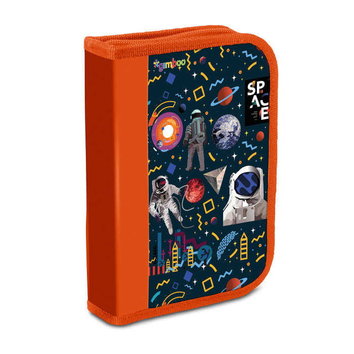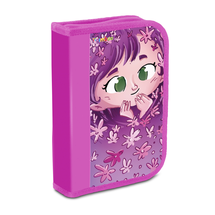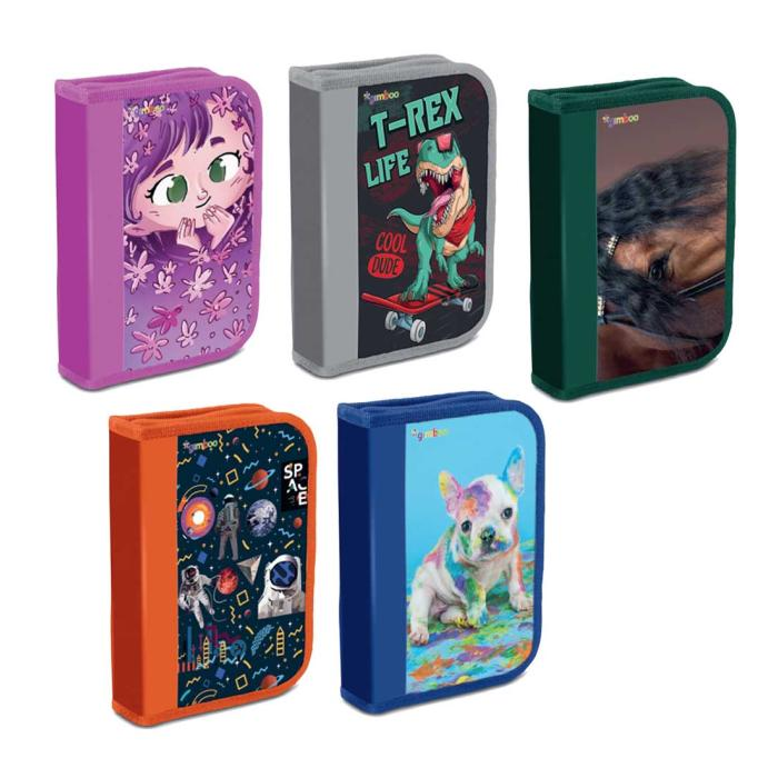 Jednokrídlový peračník s príslušenstvom, mix 10 motívov. Obsahuje 17 dielov: guma, strúhadlo, pravítko, 6 farbičiek, ceruzka, 6 fixiek, guľôčkové pero. Materiál: PVC, zapínanie na zips. Má jednu priehradku a jednu deliacu priehradku s ďalším vreckom. Farba: mix farieb a vzorov.