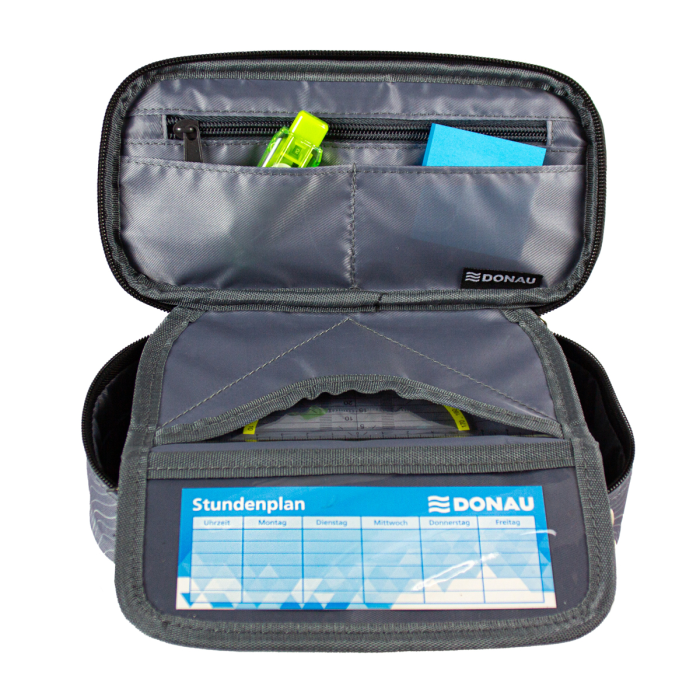 Peračník vyrobený z odolného polyesteru so zipsom. Vo vnútri sa nachádza priehradka na zips a dve praktické vrecká. Vnútorná chlopňa ponúka vrecko na štvorec a priehľadné okienko na rozvrh. Desať pútok na perá udrží veci poriadok. Peračník je prázdny.