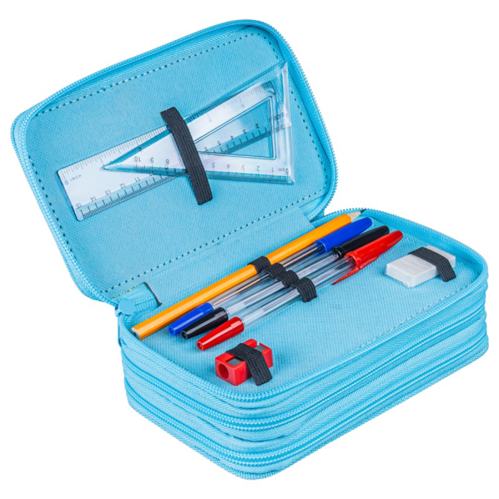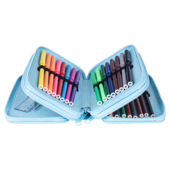 Sada obsahuje príslušenstvo (pravítko, uholník, 3 perá, ceruzku, gumu, strúhadlo, 16 fixiek, 16 pasteliek)