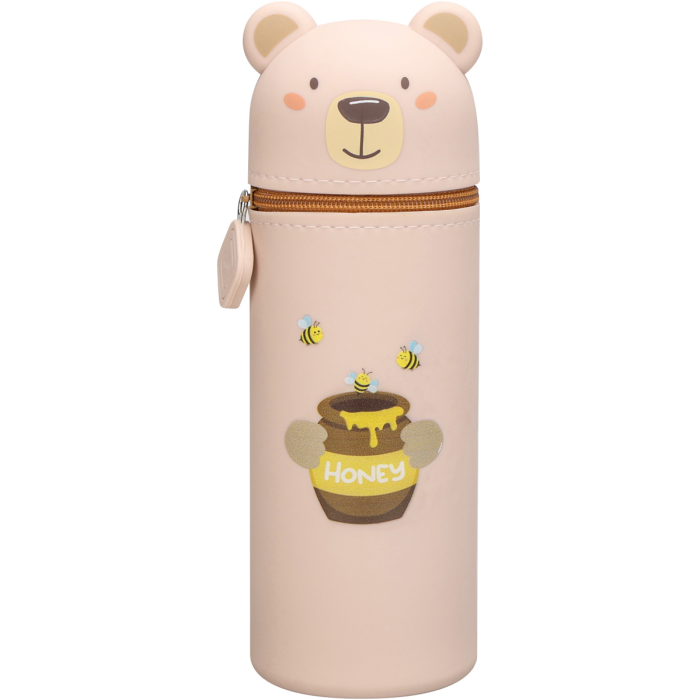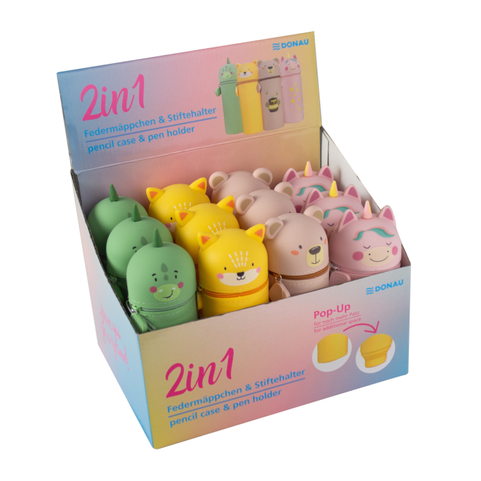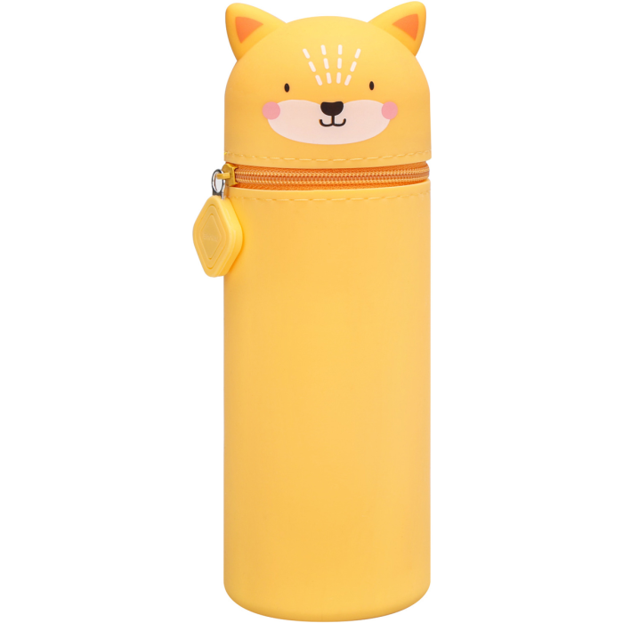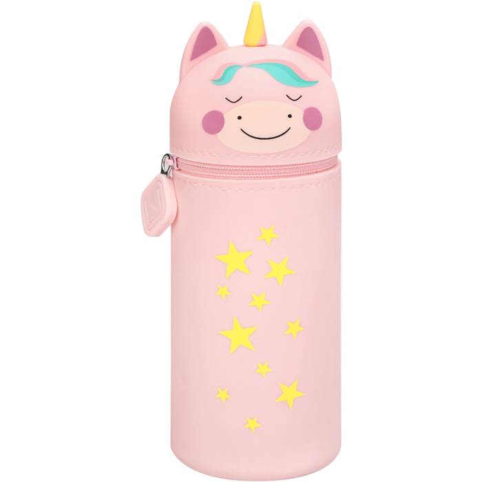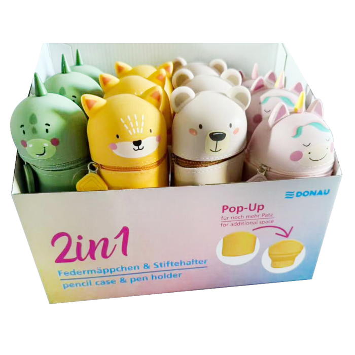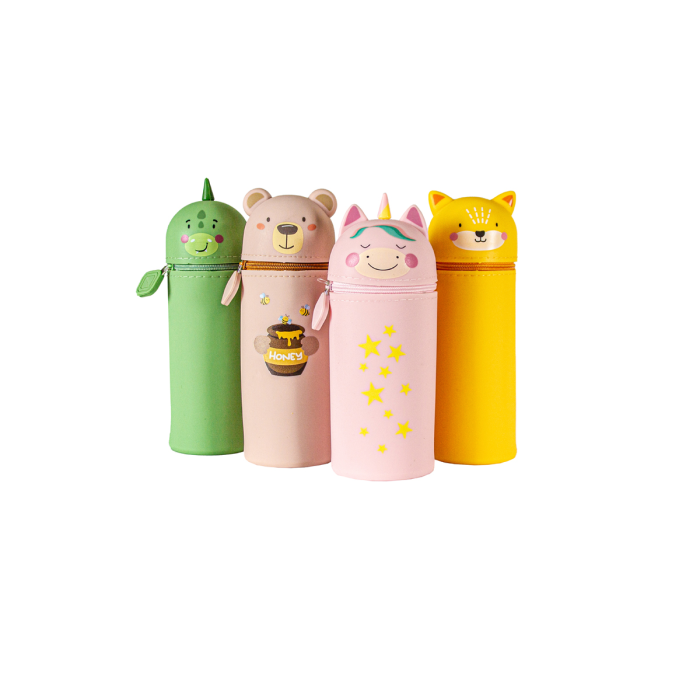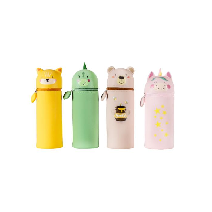 Tento peračník a stojan na perá 2 v 1 kombinuje funkčnosť a zábavu pre deti. Dostupné so štyrmi roztomilými zvieratkami (líška, dinosaurus, jednorožec, medveď) vo vitríne ponúka priestor na perá, gumy a ďalšie pomôcky. Vyrobený zo silikónu, je odolný a flexibilný. Vďaka zipsu sa dá použiť ako peračník, zatiaľ čo rozťahovacia časť umožňuje jeho vzpriamené postavenie ako stojan na perá. Rozmery: Výška v stoji 17,5 cm, v ľahu s predĺžením 21 cm, priemer 6 cm.