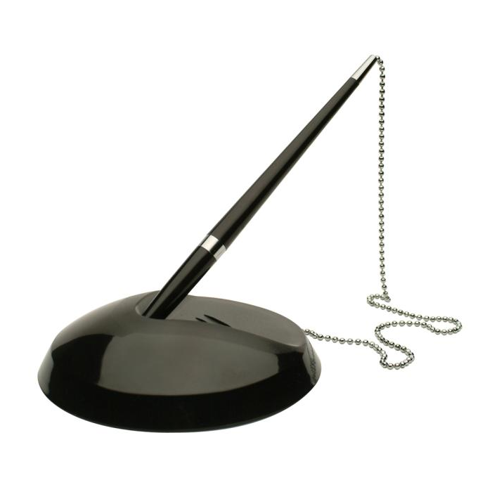 Plastové pero na stojane s prilepovacou základňou, spojené 58 cm retiazkou. Dodávané s čiernou náplňou a 2 náhradnými náplňami. Farba čierna. Rozmer tuhy 10,7cm