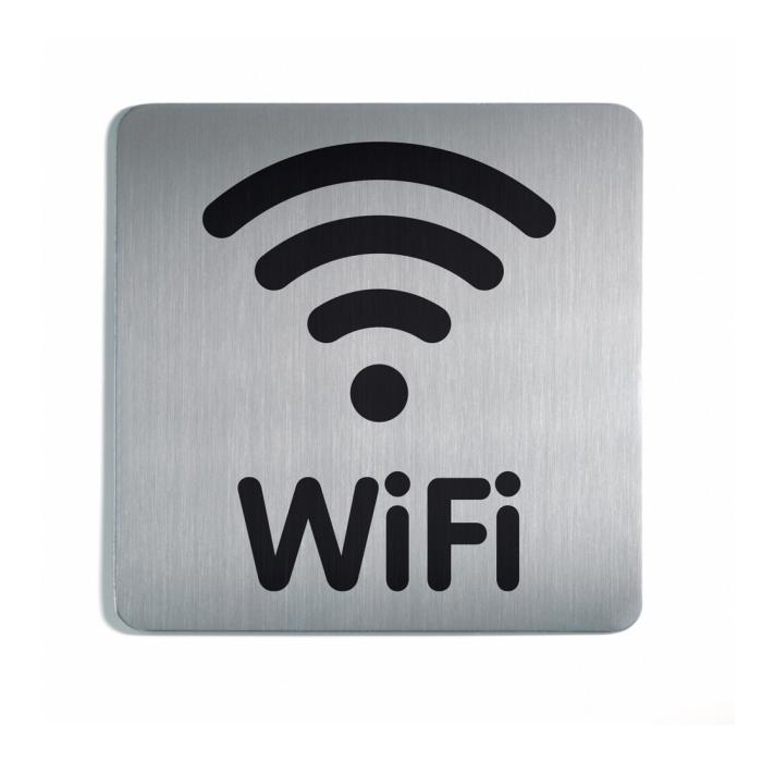Piktogram na vysokokvalitnej brúsenej nehrdzavejúcej oceli. Vytlačený symbol je odolný voči poškriabaniu a silnému opotrebeniu. Rozmer 150 × 150 mm. Vďaka lepiacej páske na zadnej strane sa dá použiť na rôzne povrchy. Farba strieborná, potlač WIFI čierna.