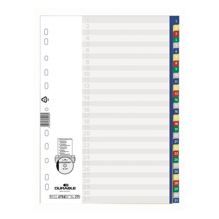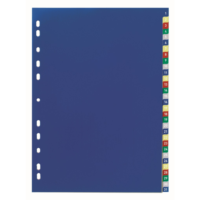 Farebný číselný rozraďovač vyrobený zo zosilneného plastu s eurodierovaním, popisovateľný papierový titulný list na ľahkú orientáciu v dokumentoch. Výsledný dokument pôsobí upravene a reprezentatívne. Väčšie balenie 20 sád.