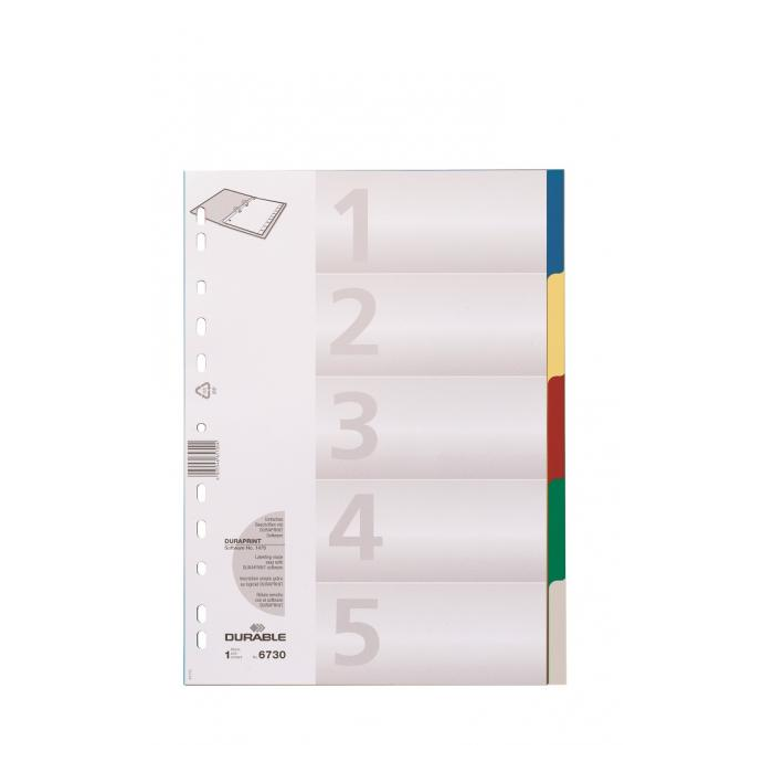 Farebný rozraďovač z polypropylénu s 5 oddielmi bez popisu. Formát A4, eurodierovanie, popisovateľný papierový titulný list na ľahkú orientáciu v dokumentoch. Balenie jedna sada v polyesterovom sáčku. Väčšie balenie 25 sád. Farba: 5 farieb Formát: A4