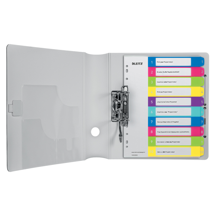 Opakovane použiteľný a extra odolný plastový číselný rozraďovač 1 - 10 v žiarivých farebných kombináciách s univerzálnou perforáciou. Materiál odolný polypropylén hrúbky 0,3 mm. Formát A4 maxi. Možnosť potlače na upravenie podľa vlastných potrieb, predloha stiahnuteľná zdarma na www.esselte.com/ easyprint.
