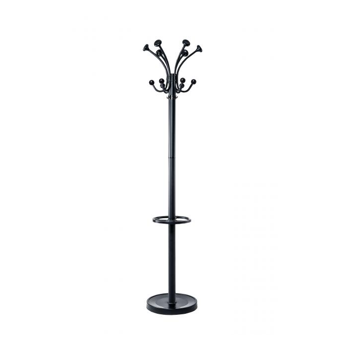 Robustný oceľový vešiak na kabáty sa hodí do každého prostredia. Ťažký betónový podklad potiahnutý plastom zabezpečuje jeho mimoriadnu stabilitu. Matný povrch odolný proti poškriabaniu dáždnikom, lesklý stĺpik, 6 vešiakov na klobúky, 6 na kabáty s priskrutkovanými hrotmi z odolného ABS plastu, 4 prídavné plastové háčiky pod vešiakmi a 4 háčiky na stojane na dáždniky, stojan priemeru 27 cm až na 8 dáždnikov alebo 4 teleskopické dáždniky. Výška 176 cm, priemer základne 36,5 cm, váha 6 kg. Rýchla a jednoduchá montáž. Farba čierna.