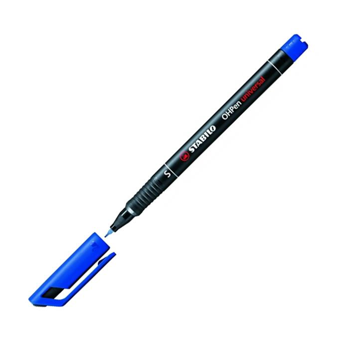 Permanentné popisovače na popisovanie takmer všetkých hladkých povrchov. Nekĺzavá úchytová zóna, praktický klip, bez vrchnáka vydrží až 3 dni. Väčšie balenie 10 ks v jednej farbe. STABILO® OHPen universal Superfine (S) Hrot okrúhly, šírka stopy 0,4 mm. Farba modrá.