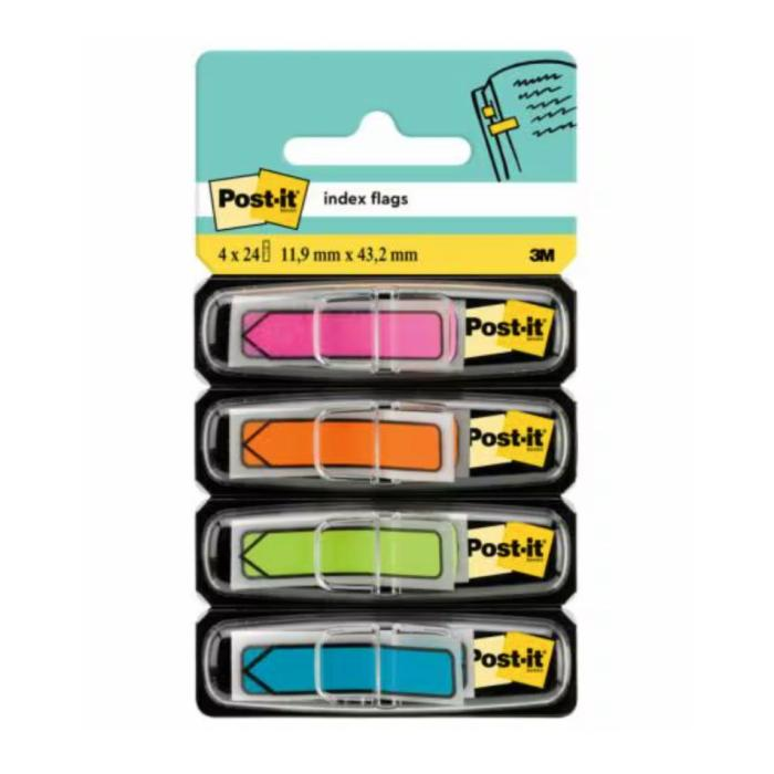 Úzke acetátové záložky do kníh, časopisov, ako register do cenníkov, kartoték, katalógov, zakladačov, archívov a pod. Priehľadná lepiaca čast a farebná časť na označenie.Prelepiteľné, znovunalepiteľné a popisovateľné. Rozmery záložky 11,9 x 43,1 mm. Dodávané v kombinácii 4 základných (červená,oranžová, modrá, žltá) alebo 4 neónových farieb )žltá, fialová, ružová. modrá) po 24 lístkov.Záložky s potlačou šípky upozorňujú na konkrétnu informáciu v texte. Šírka indexu 11,9 mm, v balení 4 farby po 24 lístkov.