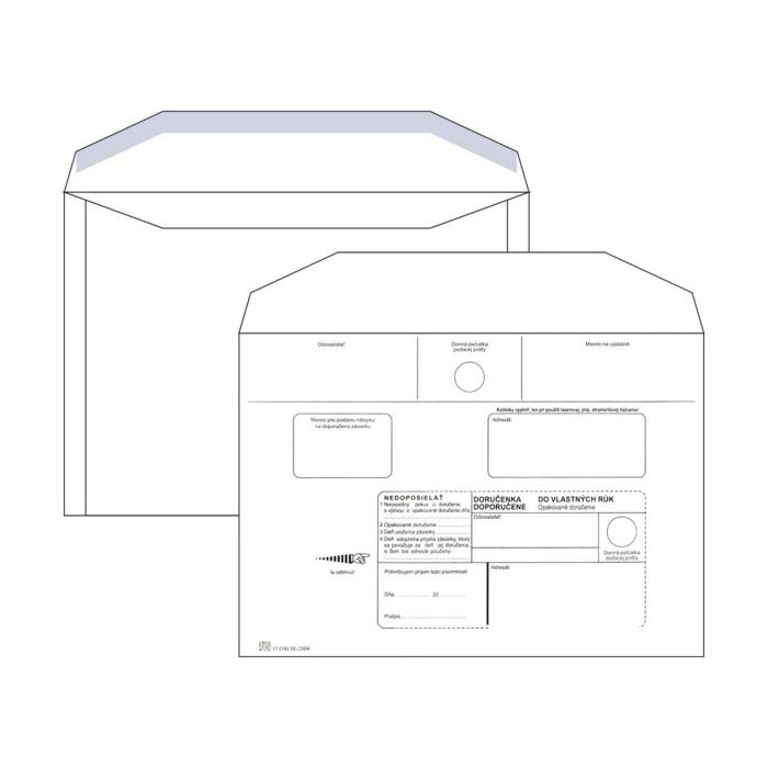 Biele papierové poštové obálky C5 s doručenkou do vlastných rúk - opakované doručenie rozmerov 162 × 229 mm s okienkom, popisom a lichobežníkovou klopou, 90 g/ m2. Balenie obsahuje 1000 ks.