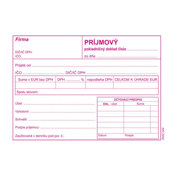 Príjmový pokladničný doklad s DPH, samoprepis, A6, blok 100 listov.